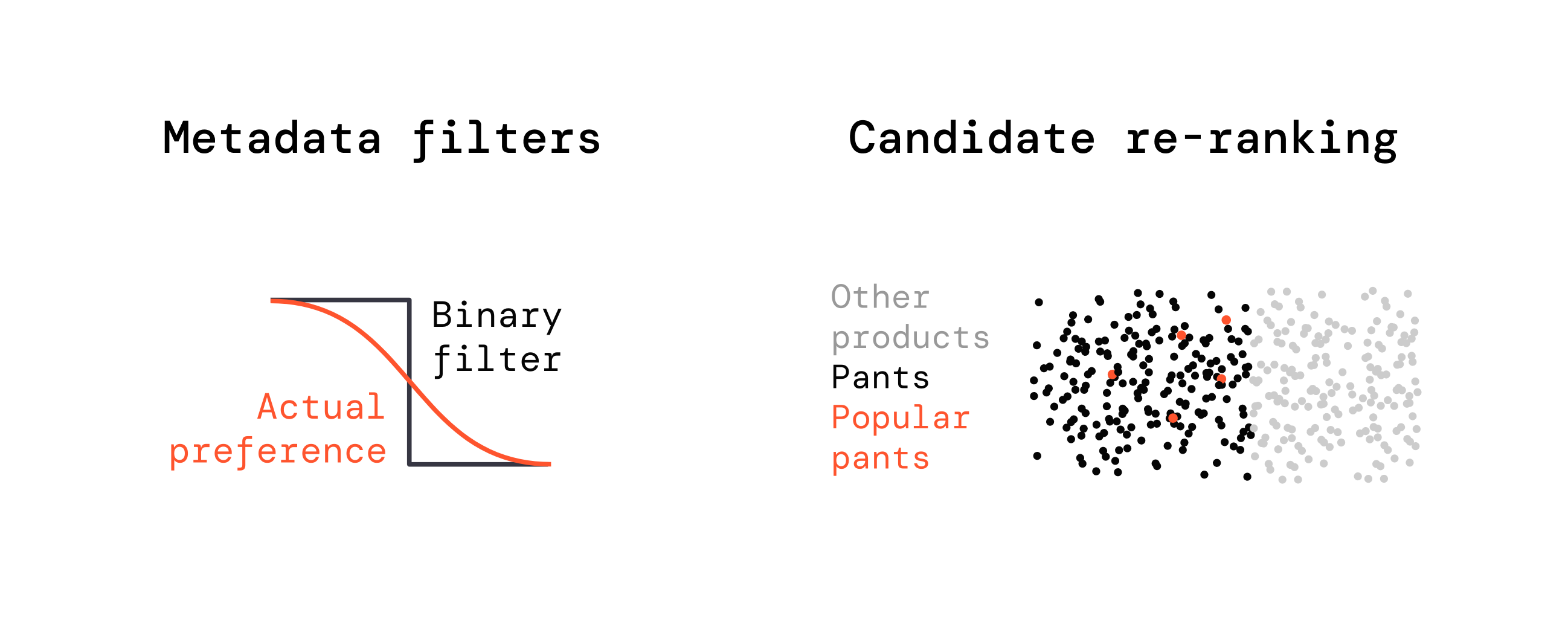 Broad queries eg “popular pants” can’t be handled by re-ranking at all, due to poor candidate recall.